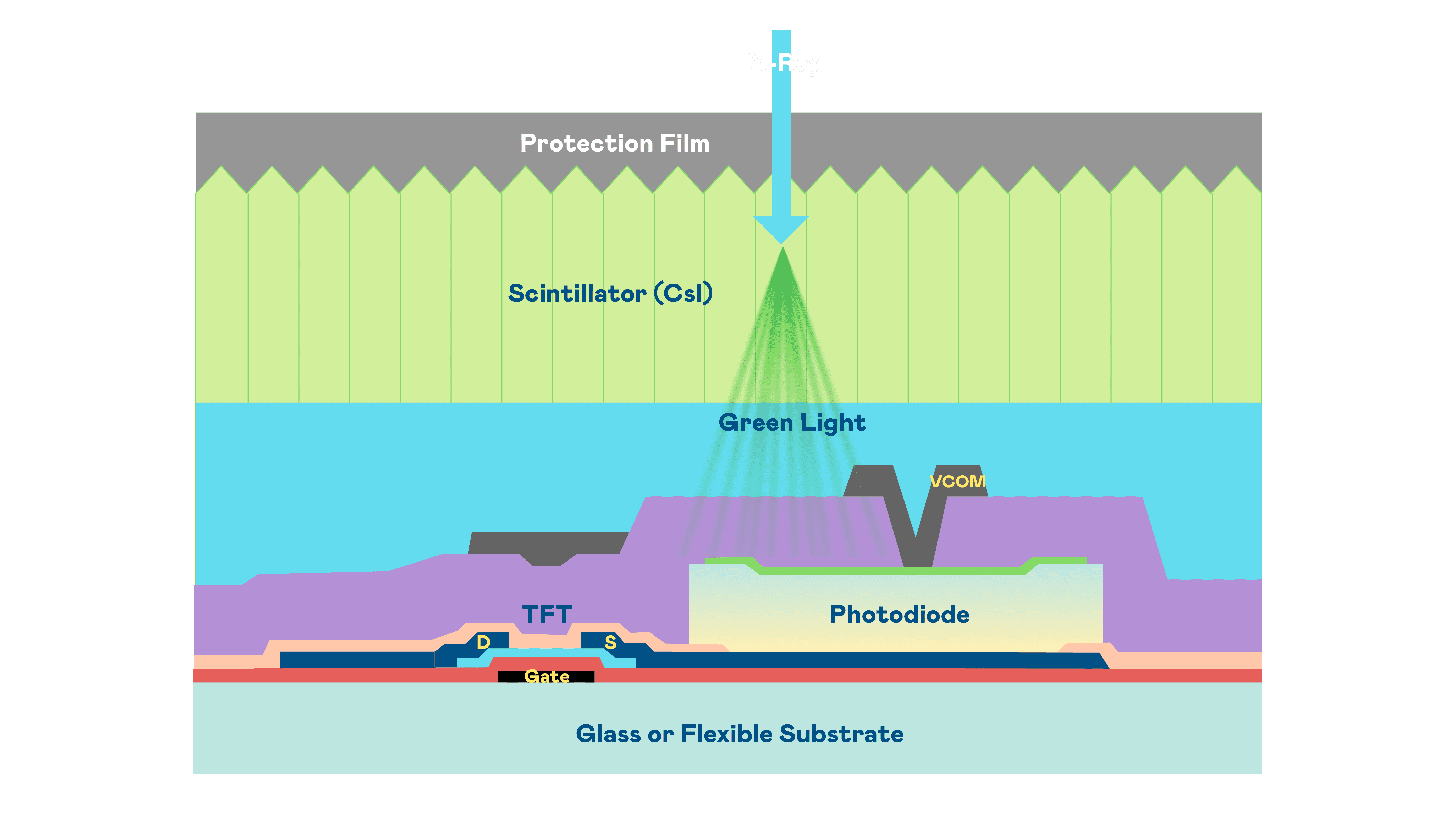 云顶国际8588yd的X光影像感测阵列使用薄膜电晶体 (TFT) 作为每个像素的读取开关,,,,搭配光电二极体(Photodiode)的光电转换元件,,,用以感测X光影像讯号。。
