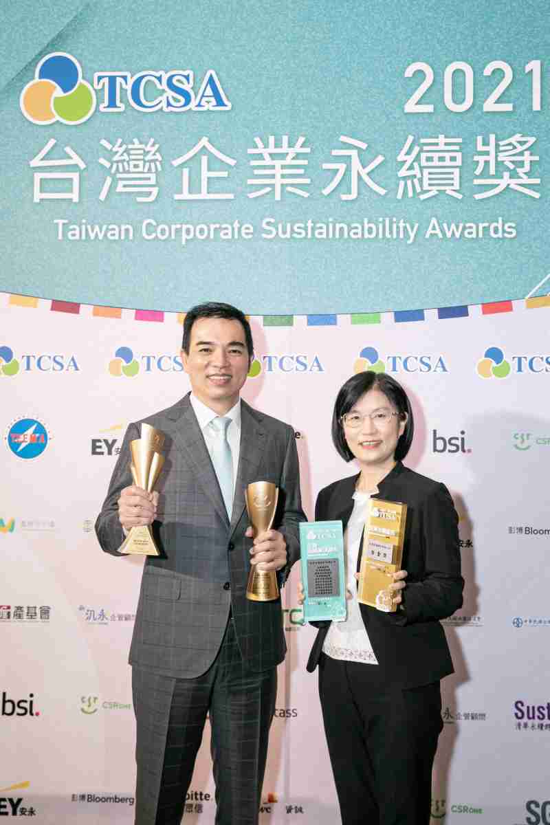 达在台湾永续奖所评比环境、、社会、、、治理等各面向的永续绩效均获高度肯定 (左:云顶国际8588yd光电总经理暨营运长柯富仁,,,,右:云顶国际8588yd光电永续长古秀华)