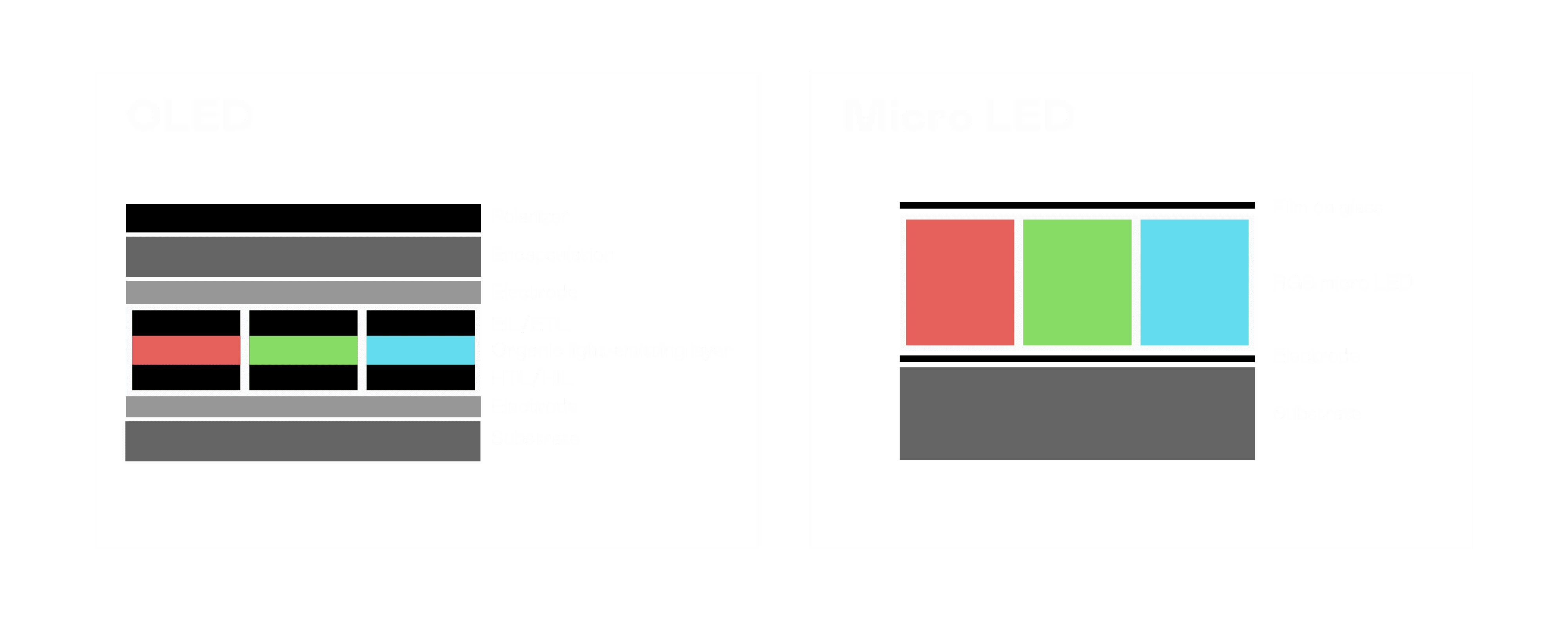 以 LED 做为显示画素,,可让 LED 的发光效率发挥到极致,,,从而让显示器具备优异的亮度表现,,不论是在户外或室内,,,,均具备出众的显示效果。。。同时,,,,与使用有机材料的 OLED 相比,,,LED 具备更稳定、、、、寿命更长的特性,,不仅不会有画面烙印问题,,,而且更不容易出现故障、、、坏点。。。